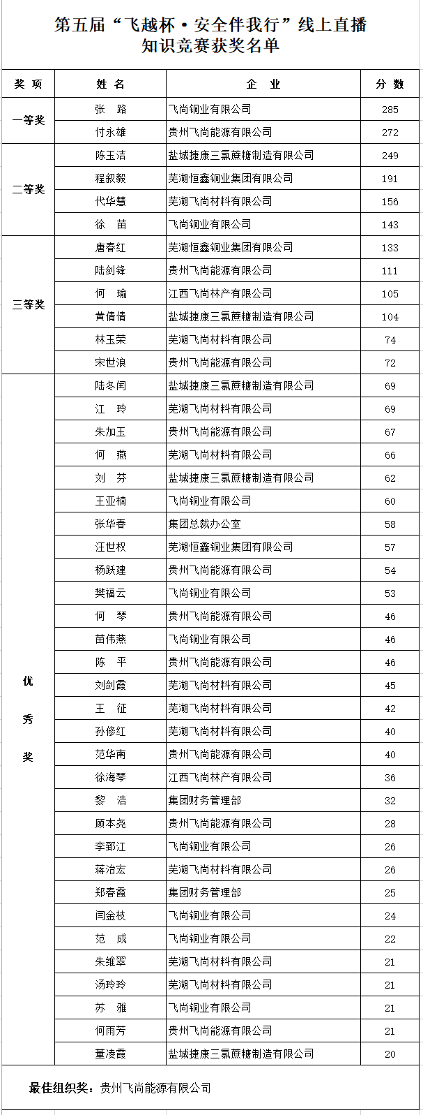 12月28日晚,飞尚团体第五届“飞越杯·宁静伴我行”线上直播常识比赛正式竣事。按照比赛法则,统计一切参赛者的终究得分,共59名参赛者取得比赛分数,此中飞尚铜业无限公司张路、贵州飞尚动力无限公司付永雄别离以285分、272分的成就取得一等奖。贵州飞尚动力无限公司因得分总数第一、参赛人数第一,取得最好构造奖。